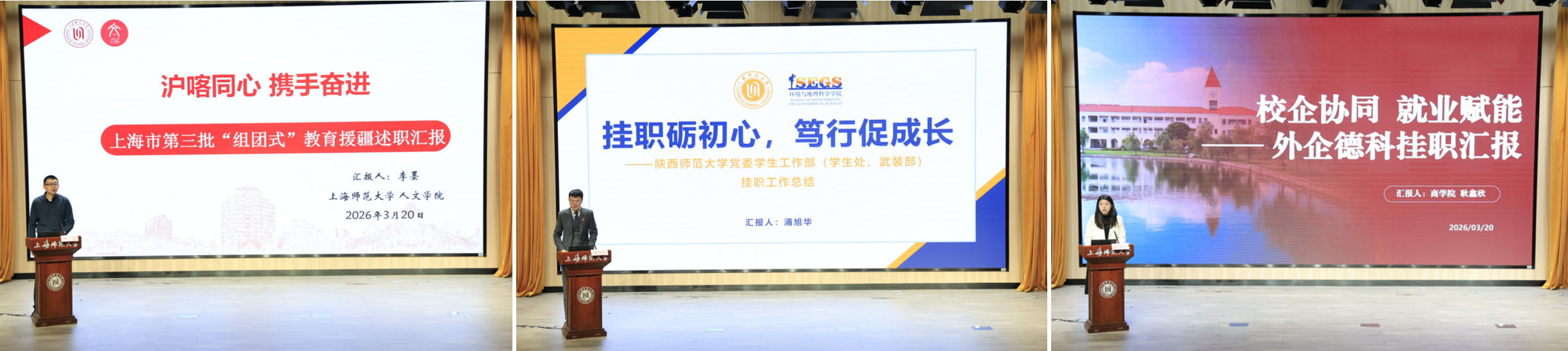 在学工系统“攀登计划”挂职研修交流环节,人文学院辅导员李墨、环境与地理科学学院辅导员涌旭华、商学院辅导员耿鑫欣分享了在“组团式”教育援疆、思政工作创新、跨校资源整合等方面的所学所悟。李墨以从教学教研、资源共享、影响辐射三个维度,展现了在喀什六中以青春笔触续写教育援疆的育人情怀;涌旭华分享了在陕西师范大学精研资助主业、深耕思政引领、精研队伍建设、精细综合保障的挂职收获;耿鑫欣结合在北京外企德科人力资源服务上海有限公司的挂职实践,探讨了如何搭建校企桥梁反哺高校就业育人工作,为与会辅导员提供了就业指导和生涯规划的经验。