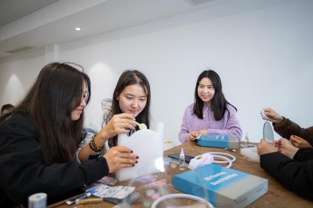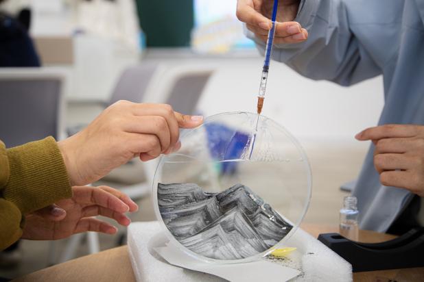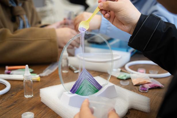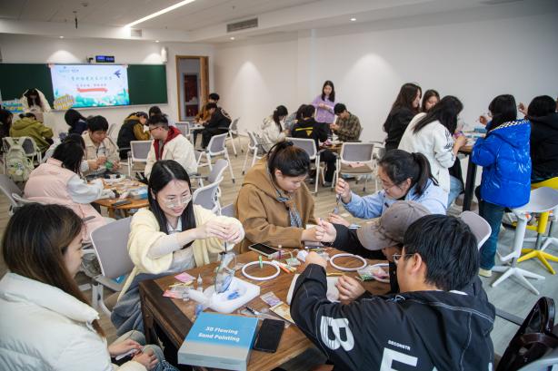 李兰老师带领同学们体验流体沙画创作。在了解制作方法与心理疗愈价值后,同学们通过色彩搭配与流沙晕染,将内心情绪与美好期许融入作品。沉浸式的创作过程有效舒缓了压力,也促进了自我表达。作品完成后,同学们以小组为单位分享创作思路与意境,在交流中进一步感受艺术联结的魅力。