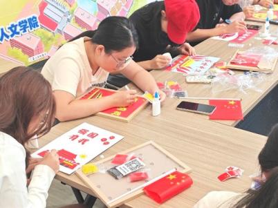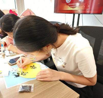 豆子画创作现场气氛热烈。红色豆粒在指尖流转,渐渐铺展成鲜艳的国旗;金黄玉米粒巧妙拼接,一轮圆月跃然纸上。同学们专注地挑选豆子、调整图案,清脆的碰撞声此起彼伏,与轻声交流汇成悦耳的乐章。一颗颗平凡的豆子,在巧手下化作深情的祝福。