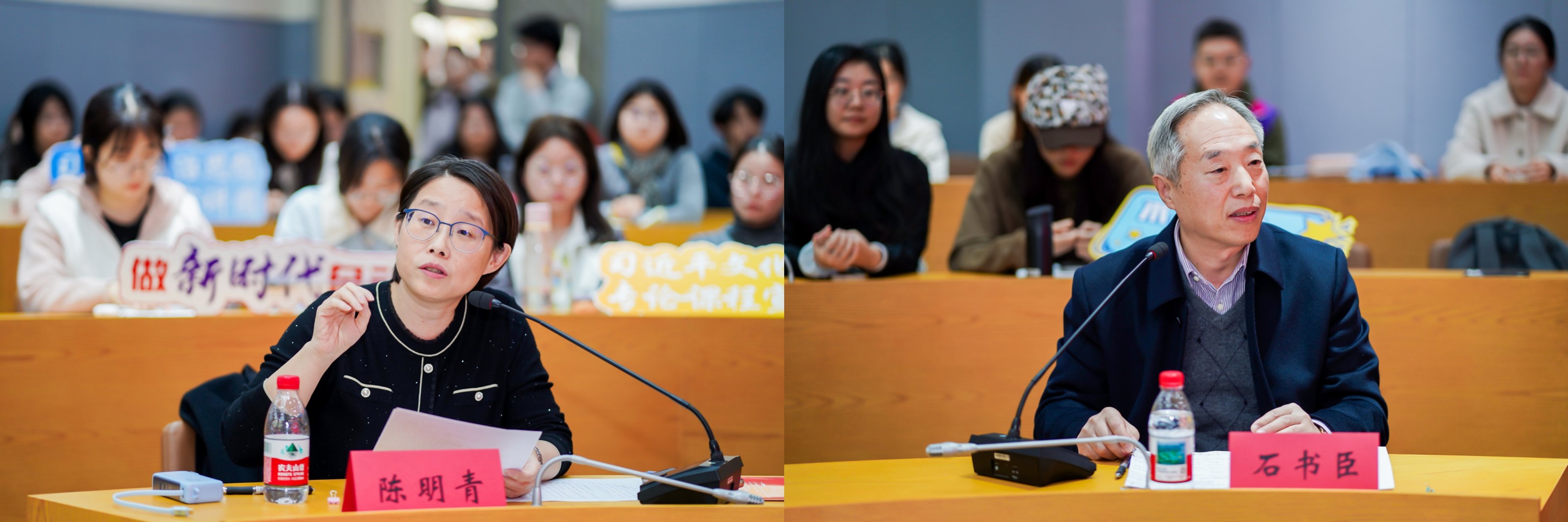 比赛现场,华东师大一附中副校长、正高级教师、我校1994级思想政治教育专业优秀校友陈明青,上海师范大学马克思主义学院教授、博士生导师石书臣分别从选题价值、学理支撑、宣讲技巧等方面进行点评。陈明青聚焦 “如何讲好”,从内容呈现、表达技巧到场景适配,给出了接地气、可操作的具体建议。石书臣立足马克思主义理论专业视角,从课程逻辑架构、核心要义内涵阐释的精准把握等方面点明了宣讲课程进一步优化的方向。