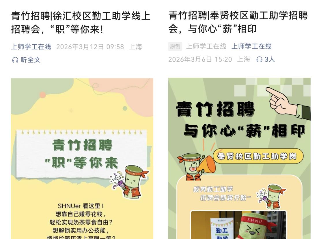 为进一步提升学生综合素质,培育师大学子自立自强的优良品质,为在校学生搭建优质的勤工助学平台,3月上旬,校学生资助管理中心在两校区举办2025-2026学年春季勤工助学招聘会。